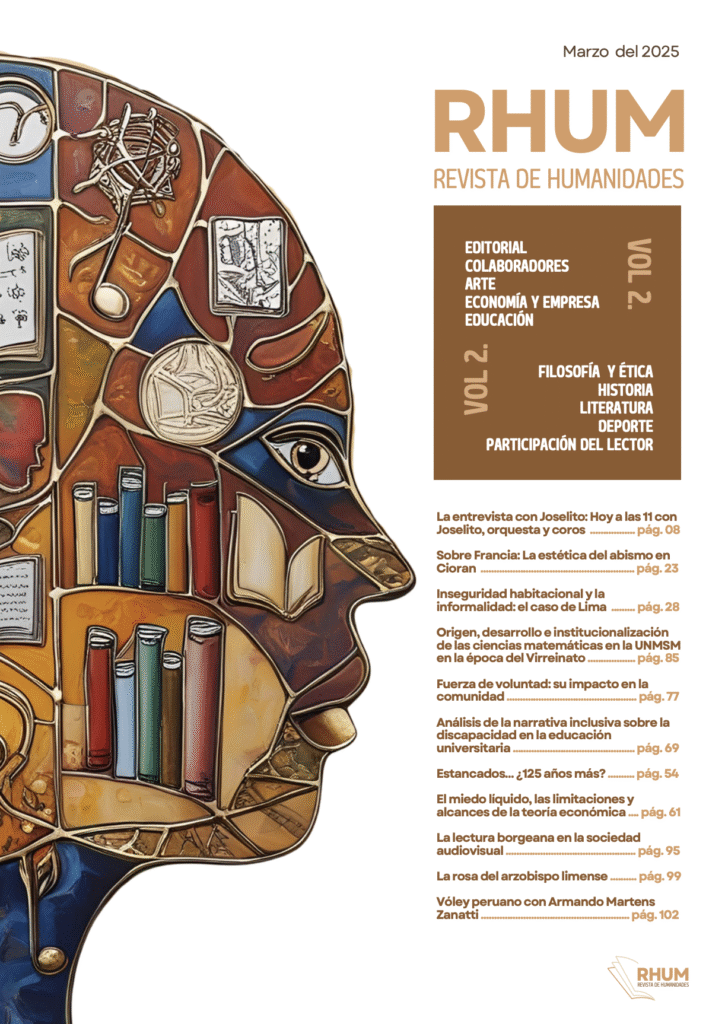 RHUM es una revista independiente de humanidades que celebra el pensamiento libre, el arte y la reflexión crítica. Reúne voces diversas, docentes, artistas, investigadores y lectores que dialogan desde el ensayo, la narrativa, la poesía o la ilustración para explorar lo humano en todas sus formas. Sin filiaciones ni fronteras disciplinarias, RHUM es un espacio abierto, plural y en constante construcción, donde las ideas, la memoria y la imaginación se encuentran para mirar el mundo con ojos nuevos.
